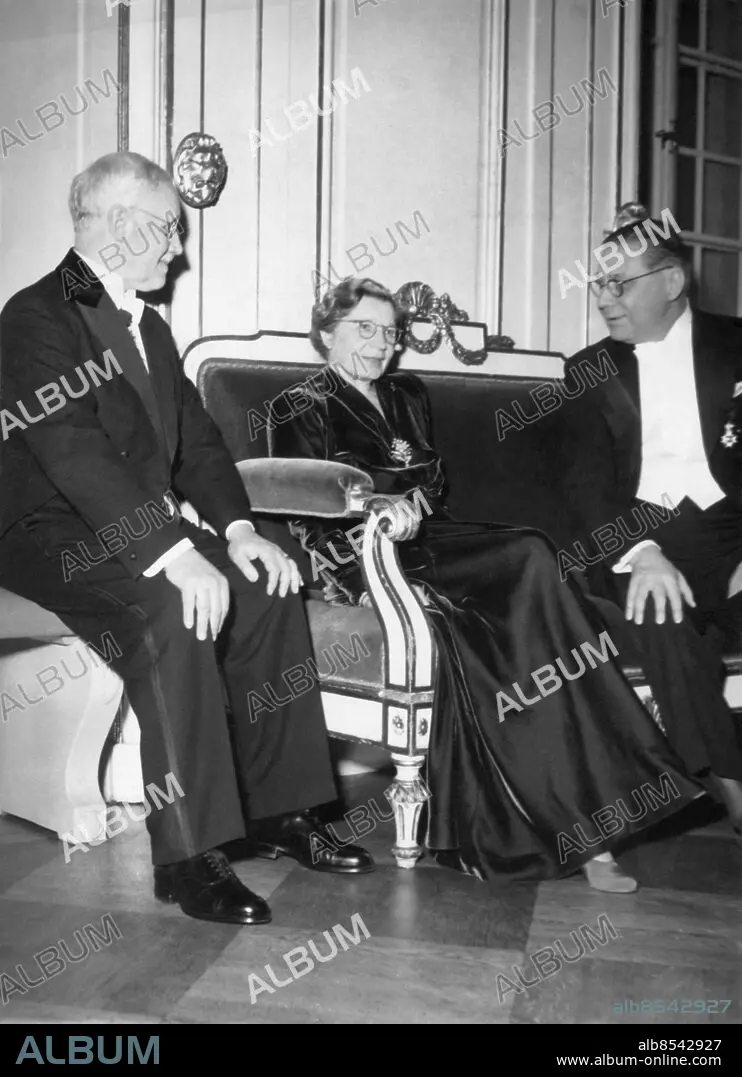 Orig. bildtext... Svenska Akademiens årshögtid. Nyinvalda fru Elin Wägner mellan prof. Bengt Hesselman och Gustaf Hellström 20-12-44 Anm.Wägner, Elin, f. 16 maj 1882, d. 7 januari 1949, författare, journalist trio CD402 persons: BENGT HESSELMAN;GUSTAF HELLSTRÖM;ELIN WÄGNER sites: SVERIGE
