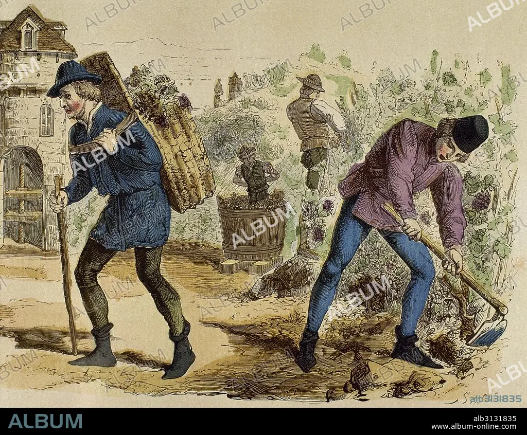 France. 15th century. Peasants working during the harvest. Engraving by Stablo. Colored.