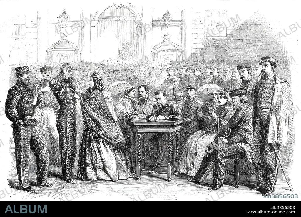 Caption: Presentation of medals to Garibaldi's veterans in the Grand Square, Naples, 1860. Italian soldiers are decorated. 'Nearly the last act of Garibaldi, before closing his career, for the time, in Italy was to assist at the ceremony of presenting the commemorative medal to the chosen band that landed with him at Marsala on the 11th of May last. They mustered on that day 1080, but of these only 426 survived to receive the decoration. The presentation took place in the Largo del Palazzo on the 4th November. The Hungarian cavalry, a noble-looking set of fellows, were in front of the palace. There were red-jackets, too, on the three sides of the square, and nearly in the centre was seated Garibaldi, together with a number of ladies of high rank, and the deputation from the municipality of Palermo, all on painted chairs, whilst two or three common wooden tables placed before them bear all the trays full of medals, and another the register of the names...As they were called the men came up through two files of their countrymen, and the Duchess Verdura pinned on a medal to their breasts'. From "Illustrated London News", 1860.