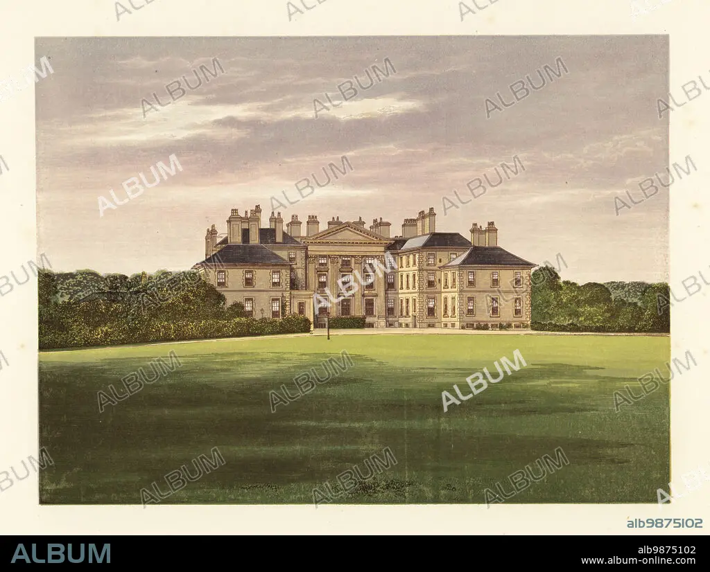 Caption: Dalkeith Palace, Edinburgh, Scotland. Mansion house with Corinthian-order pilasters and pediment built in 1702 by architect James Smith. Home of Walter Francis Scott, 5th Duke of Buccleuch. Colour woodblock by Benjamin Fawcett in the Baxter process of an illustration by Alexander Francis Lydon from Reverend Francis Orpen Morriss Picturesque Views of the Seats of Noblemen and Gentlemen of Great Britain and Ireland, William Mackenzie, London, 1880.