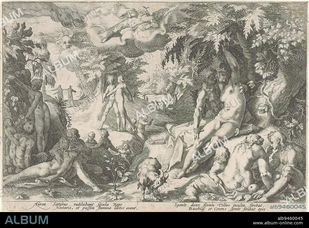 The Golden Age, Metamorphoses of Ovid (series title), Depiction of life during the Golden Age: naked men and women in an idyllic landscape, caressing, walking, bathing, eating fruit and playing with children. The god Saturn lies on a cloud. In the lower margin a four-line commentary, in two columns, in Latin., print maker: Hendrick Goltzius, (workshop of), after design by: Hendrick Goltzius, Franco Estius, Haarlem, 1589, paper, engraving, height 175 mm × width 255 mm