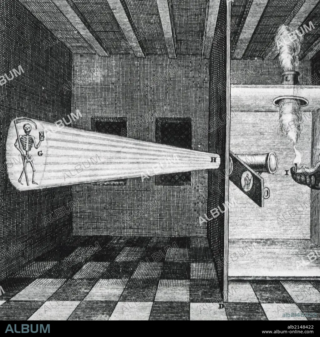 Caption: First illustration of a Magic Lantern. From ''Ars magna'', Amsterdam, 1671, by Athanasius Kircher. (Photo by: Universal History Archive/UIG via Getty Images)