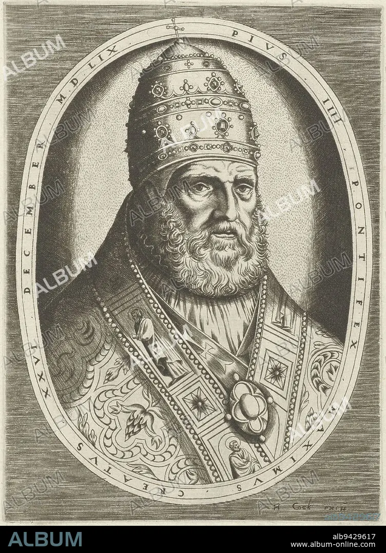 Caption: Portrait of Pope Pius IV dressed in the papal robe, head adorned with the papal tiara. Bust to right in oval frame with edge lettering in Latin, Portrait of Pope Pius IV Portraits of Kings, Queens, Princes and Princesses (series title), print maker: Frans Huys, publisher: Hieronymus Cock, (mentioned on object), Antwerp, 1559 - 1562, paper, engraving, h 202 mm × w 148 mm