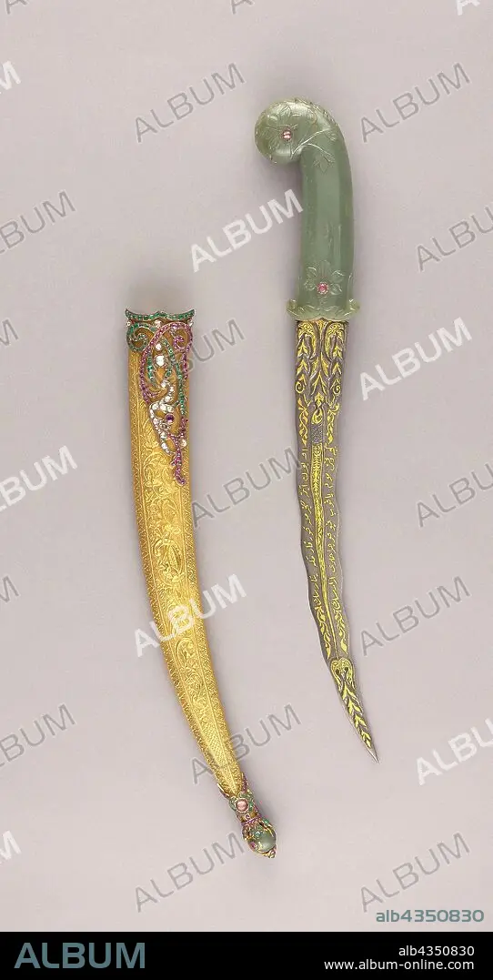 Caption: Dagger (Khanjar) with Scabbard, 18th/19th century, Blade, Iranian, dated 1128 Hejira (A.D. 1715), Ottoman Turkish, Dahestan, Steel, gold, and jewels, L. 45.8 cm (18 in.)