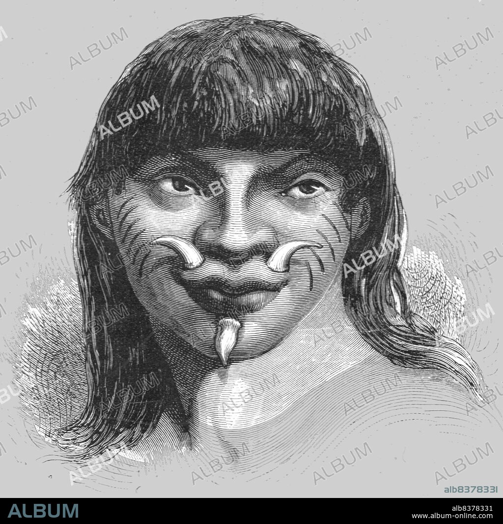 Mura Indian, with Lip Ornaments; A Trip up the Trombetas', 1875. [Indigenous man from the Trombetas River region of the Amazon in South America]. From, 'Illustrated Travels' by H.W. Bates. [Cassell, Petter, and Galpin, c1880, London] Belle Sauvage Works.London E.C.