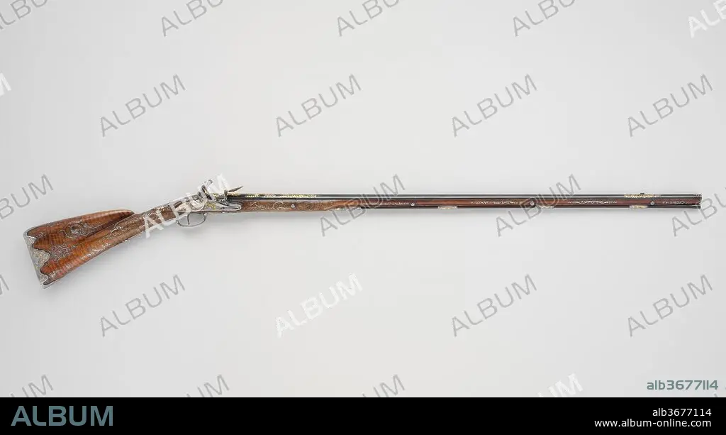 This slender and elegant gun represents the great refinement of form, design, and function achieved by French gunmakers in the eighteenth century and emulated across Europe. The delicate silver wire inlays of its stock are based on French pattern books from 1705, while the carved and chiseled ornament of the stock, lock, and other fittings shows a wide range of Rococo motifs drawn from designs published as late as the 1740s.