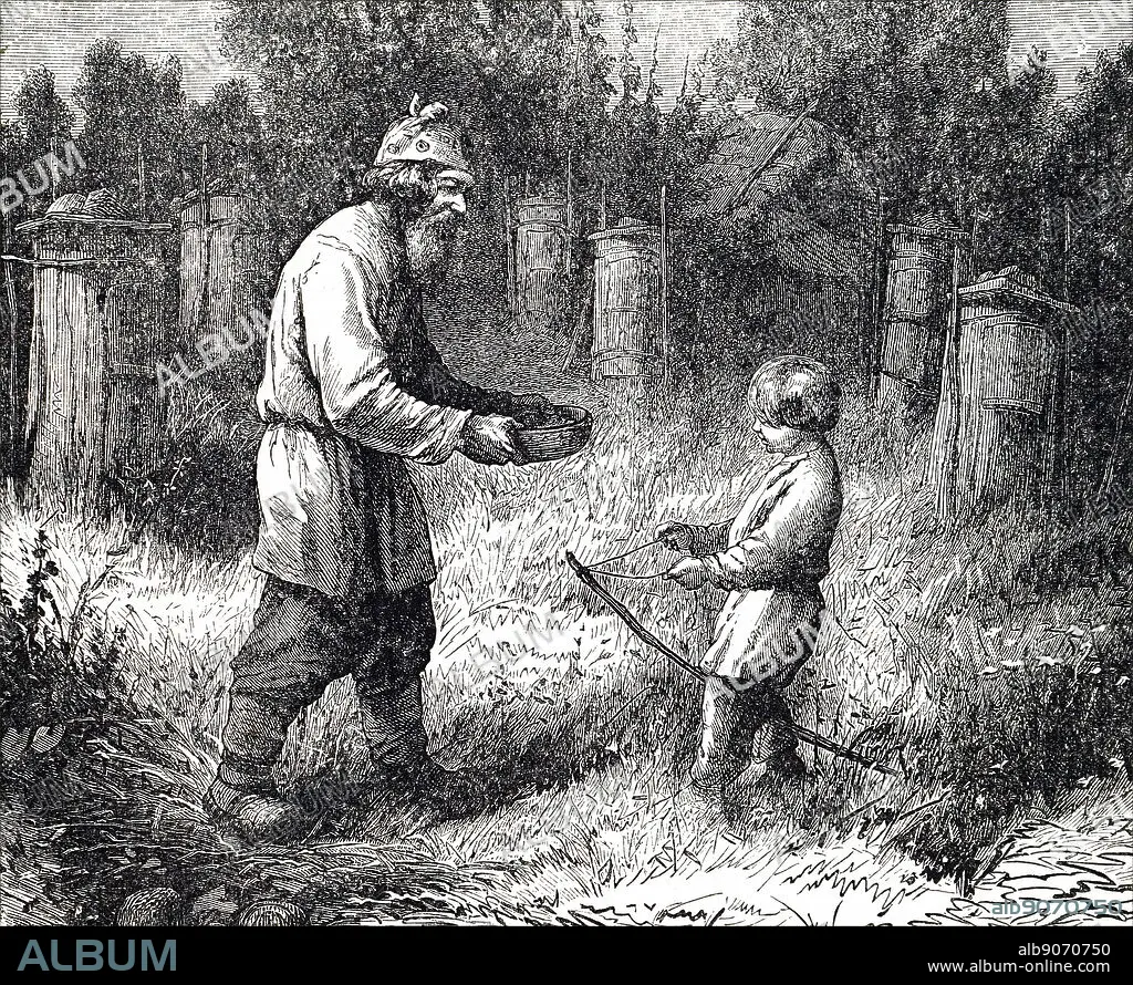 Caption: Engraving depicting a Russian beekeeper. Beekeeping (or apiculture) is the maintenance of honey bee colonies, commonly in man-made hives, by humans. Dated 19th century