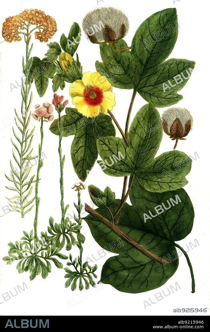 Caption: Botany, Plants, Gnaphalium angustifolium, montanum, different varieties of dysentery weed and cotton (Gossypium) arboreum, frutescens, Historical, digitally restored reproduction from a 19th century original