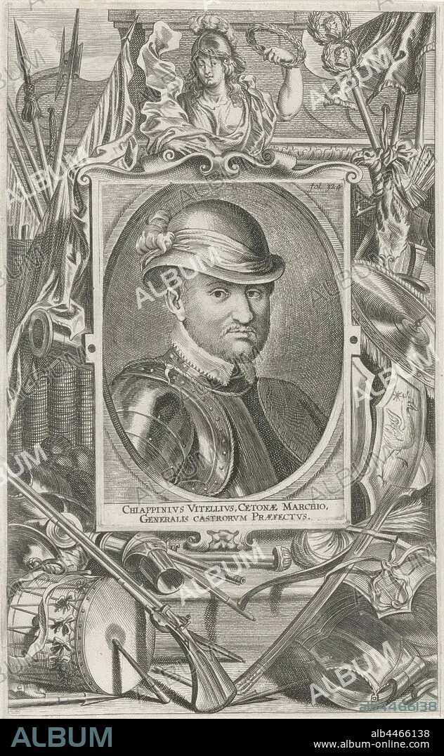 Portrait of Giovan Luigi Vitelli, Portrait of Giovan Luigi 'Chiappino' Vitelli, Marquis of Cetona and General in the Spanish Army of Flanders. Around the portrait a list with various weapons and army attributes, at the top Minerva with laurel wreath. Portrait on the upper right marked: fol. 324. Printed from two plates, weapons, Giovan Luigi Vitelli, Arnold Loemans, 1632 - 1661, paper, engraving, h 130 mm × w 92 mm × h 272 mm × w 166 mm
