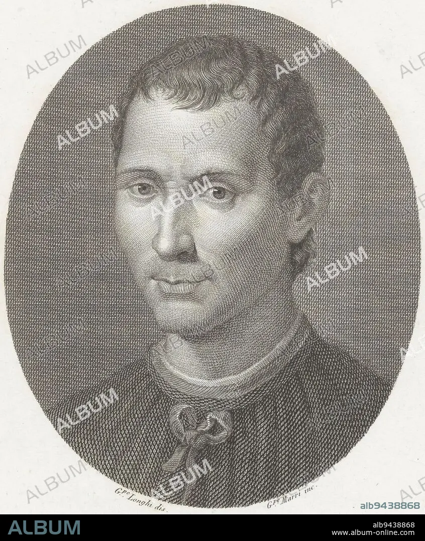 Caption: Portrait of Niccolo Machiavelli Portraits of famous Italians in ovals , print maker: Giuseppe Marri, (mentioned on object), intermediary draughtsman: Giuseppe Longhi, (mentioned on object), after: Santi di Tito, (mentioned on object), Italy, 1798 - 1852, paper, engraving, h 330 mm, w 241 mm