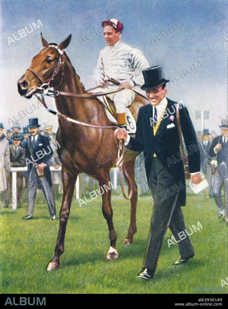 Caption: Bois Roussel, Jockey: E. C. Elliott', 1939; being led in by his owner Peter Beatty after victory at the Epsom Derby in 1938. Edward Charles Charlie Elliott (1904 - 1979) was a twice British Champion flat racing jockey. He spent a large part of his riding career in France, riding for Marcel Boussac. In 1999, the Racing Post ranked Elliott as sixth in their list of the Top 50 jockeys of the 20th century. In total, he won fourteen British Classic Races. From Racehorses & Jockeys, 1938 - A Series of 40. [W. D. & H. O. Wills, Bristol, 1939]
