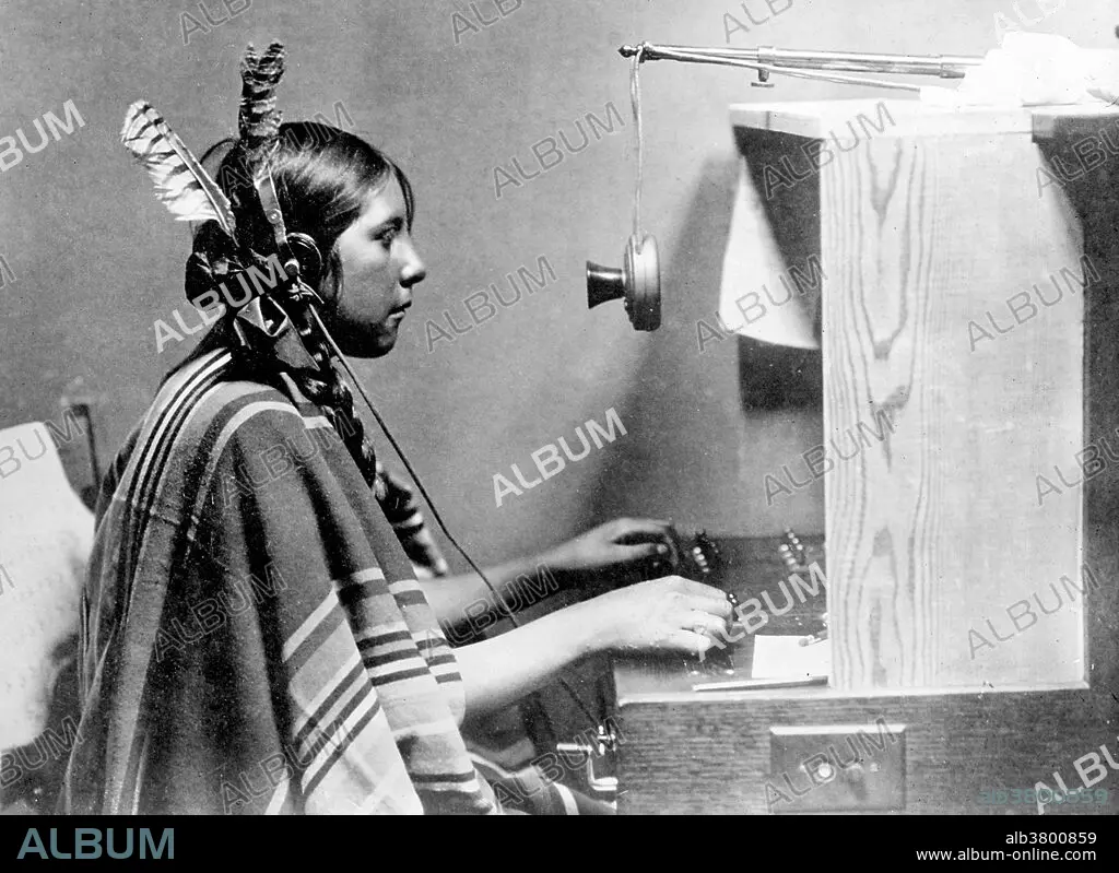 Caption: Indian telephone switchboard operator - "Helen of Many Glacier Hotel." In the early days of telephony companies used manual telephone switchboards, and switchboard operators connected calls by inserting a pair of phone plugs into the appropriate jacks. Each pair of plugs was part of a cord circuit with a switch associated that let the operator participate in the call. Each jack had a light above it that lit when the telephone receiver was lifted. Lines from the central office were usually arranged along the bottom row. Before the advent of automatic exchanges, an operator's assistance was required for anything other than calling telephones across a shared party line. Callers spoke to an operator at a Central Office who then connected a cord to the proper circuit in order to complete the call. Automatic, or Dial systems were developed in the 1920s to reduce labor costs as usage increased, and to ensure privacy to the customer. Companies observed that women were generally more courteous to callers. However, a contributing factor to women entering this workforce was because women were paid from one half to one quarter of a man's salary. Photographed by Bain News Service, June 26, 1925.
