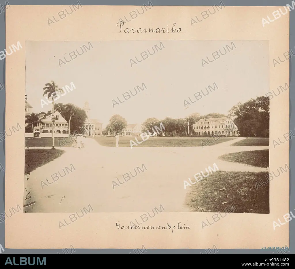 Caption: Gouvernementsplein (title on object), View of the Gouvernementsplein in Paramaribo. Part of a group of 44 photographs of Paramaribo, Suriname and Curaçao, c. 1900-1905, mounted on cardboard and inscribed., Eugen Klein (attributed to), Paramaribo, 1900 - 1905, photographic support, cardboard, height 162 mm × width 232 mm