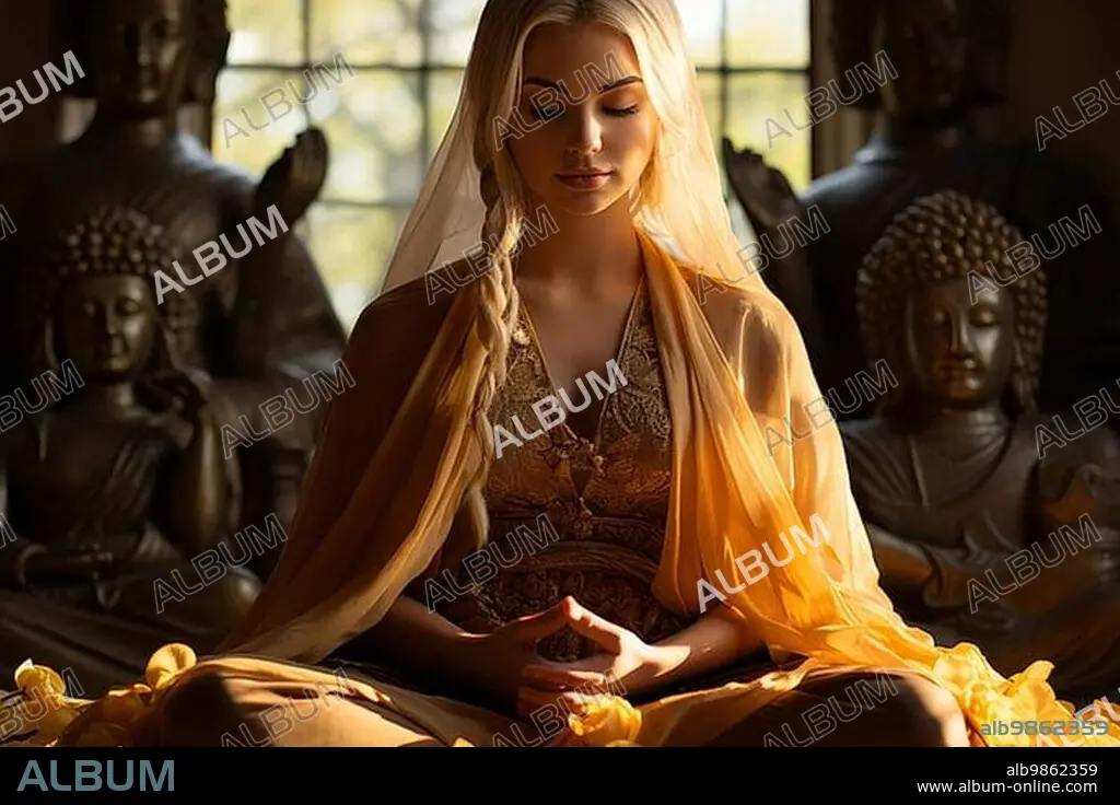 Young blonde woman meditating in a Buddhist temple, Buddha statues behind, AI generated