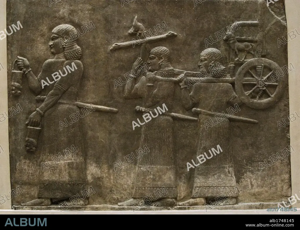 Caption: MESOPOTAMIC-ASSYRIAN ART. SERVANTS CARRYING THE SARGON CART. Relief from the PALACE OF SARGON II in Dur Sharrukin, ancient Assyria (Current Khorsabad in Iraq). 713-716 BCE (8th century BC). Louvre Museum. Paris. France.