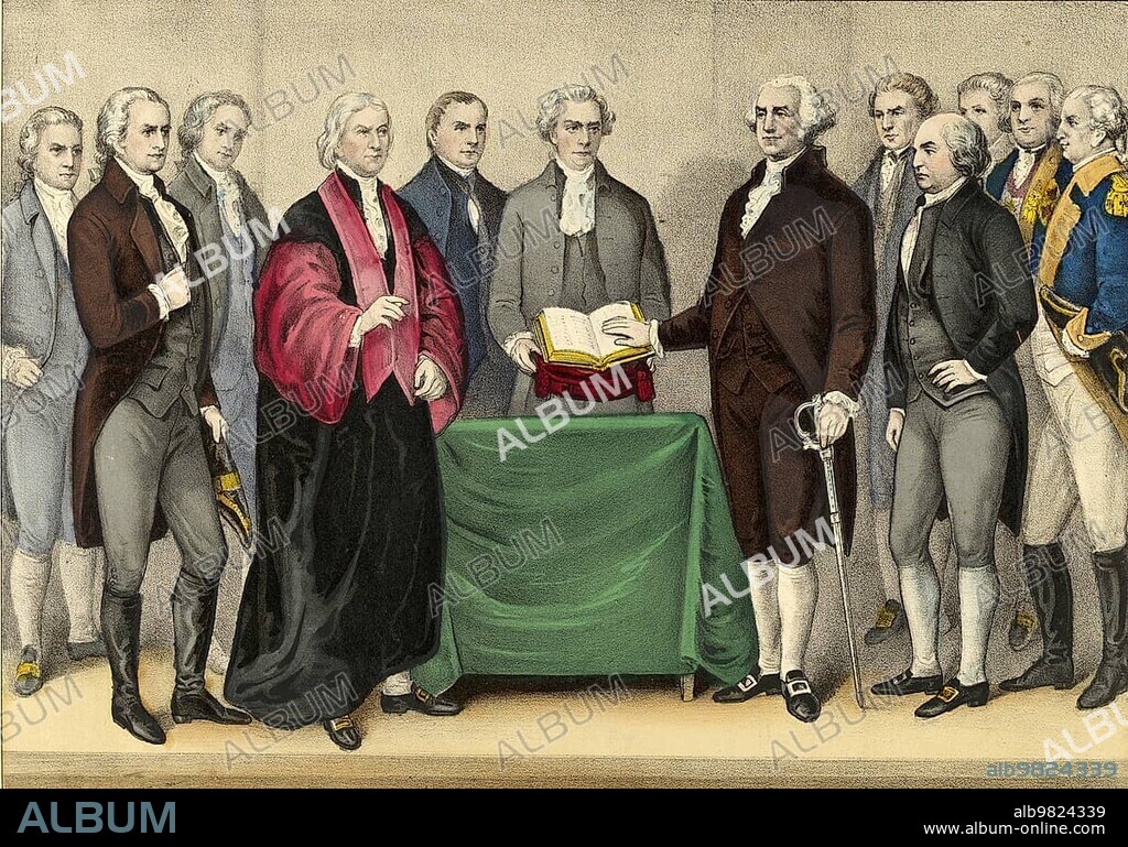 Caption: The Inauguration of Washington as the First President of the United States; 30 April 1789; In Old City Hall; New York; The Oath of Office was administered by Chancellor Livingston of the States of New York; Mr. Otis; Secretary of the Senate; holds up the Bible on a crimson cushion; Historic; digitally restored reproduction from a 19th century original
