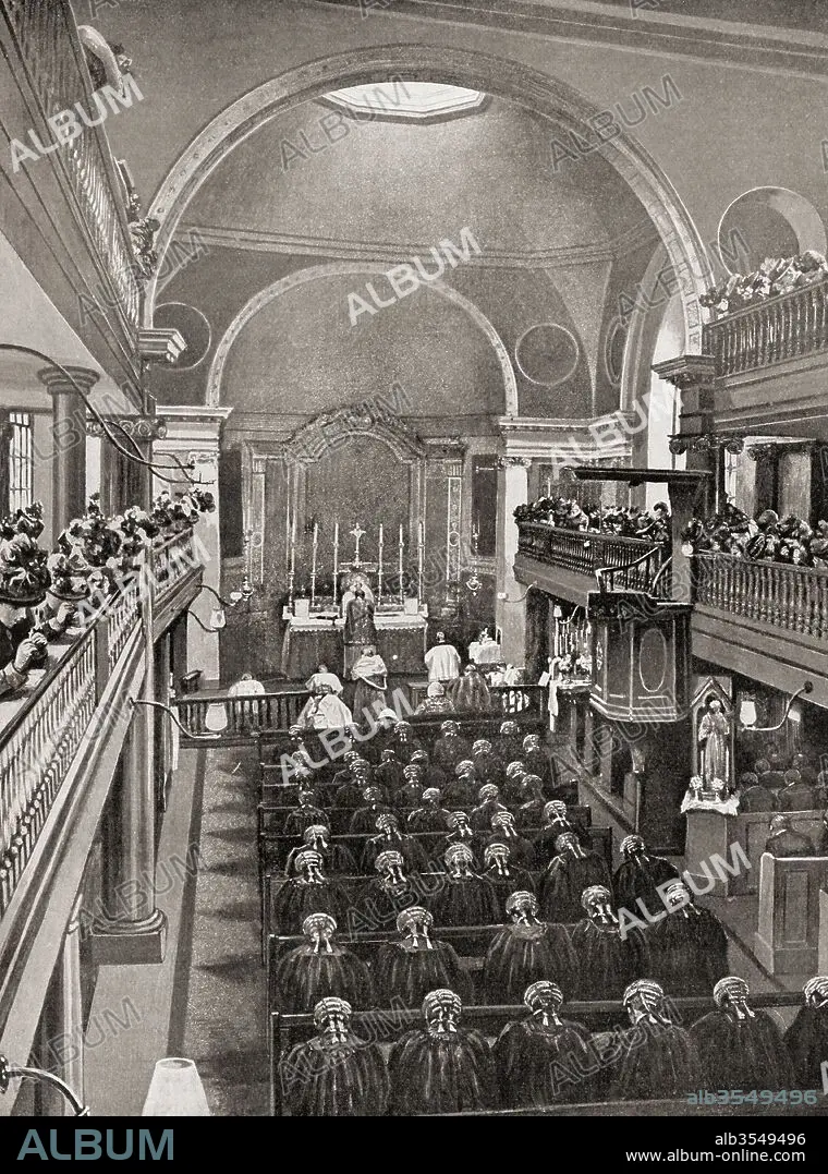 Caption: A Red Mass at Sardinia Street Chapel, Lincoln's Inn, London, England in the late 19th century. A mass celebrated annually in the Catholic Church for judges, attorneys, law school professors, students, and government officials. From Living London, published c.1901