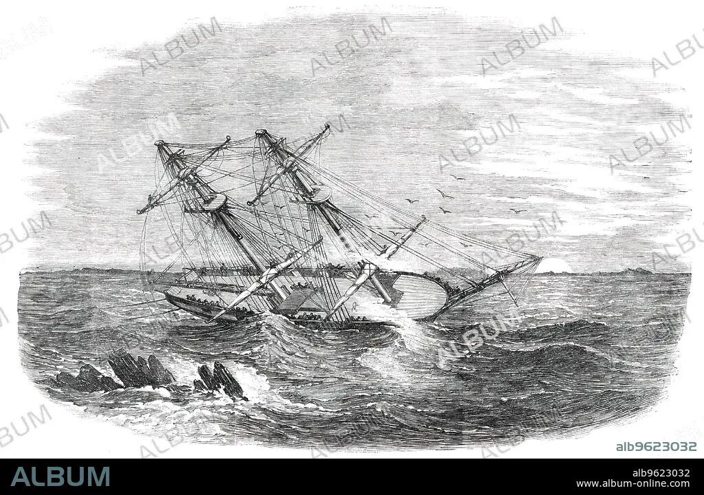 Caption: H.M.S. "Sappho", on the Main Reef at Honduras, 1850. 'Small low islands are seen in the distance, and in the foreground are low rocks, with seas breaking over...On the morning of the 9th of December last, H.M.S. Sappho struck on the Main Reef, off the coast of Honduras. She is the only vessel ever saved from total shipwreck off that reef, which is one of the most dangerous in the world...rain...descended like a vast sheet of water-it blowing strong, with violent squalls...after thirty hours, the officers and ship's company succeeded in heaving her off into deep water, with the loss of her rudder, false keel,and part of her cutwater...eventually she weathered the reef and rocks by about half a cable's length, the ship's company giving three cheers...afterwards, we recovered everything that had been hove overboard, including guns, anchors, cables, &c'. From "Illustrated London News", 1850.