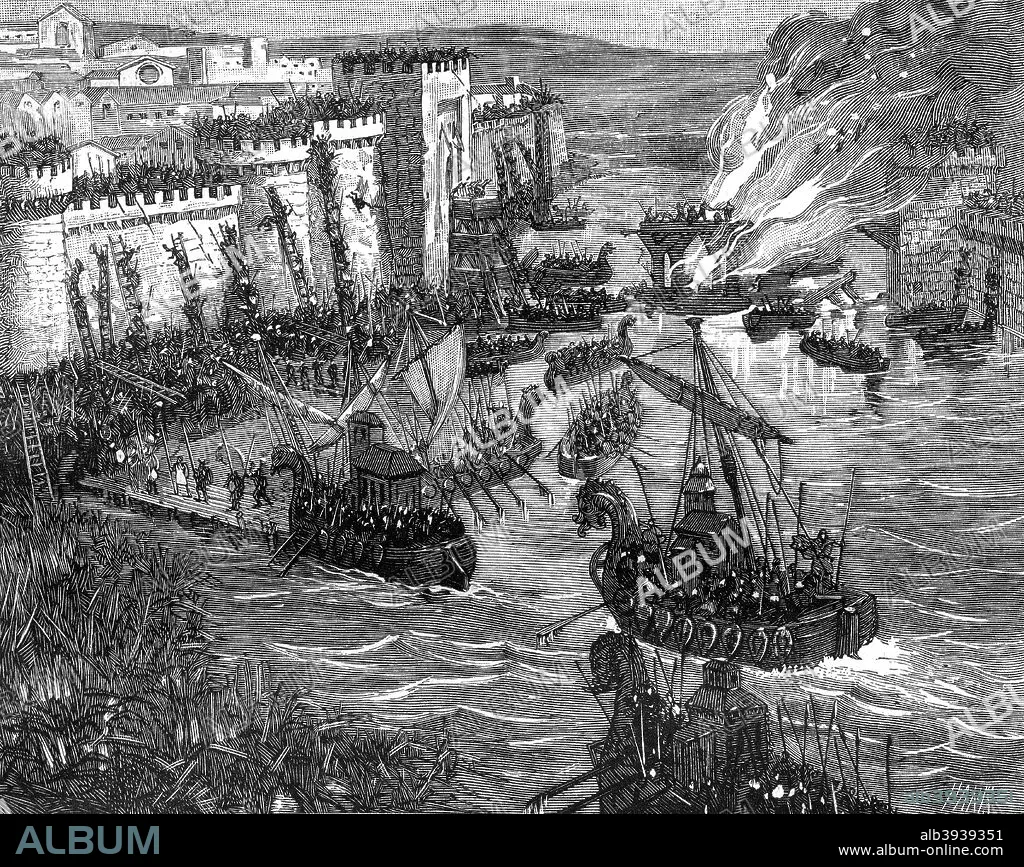 The Viking attack on Paris, 885 (1882-1884). The Vikings rowed up the Seine to attack Paris on several occasions in the 9th century, the first being in 845. The largest raid came in 885 and resulted in a siege that lasted almost a year. The city, commanded by Odo, Count of Paris, held out and in October 886 an army commanded by the King of the Franks and Roman Emperor Charles the Fat arrived and bought peace with the Vikings. A print from La France et les Français à Travers les Siècles, Volume I, F Roy editor, Saint-Antoine, 1882-1884.