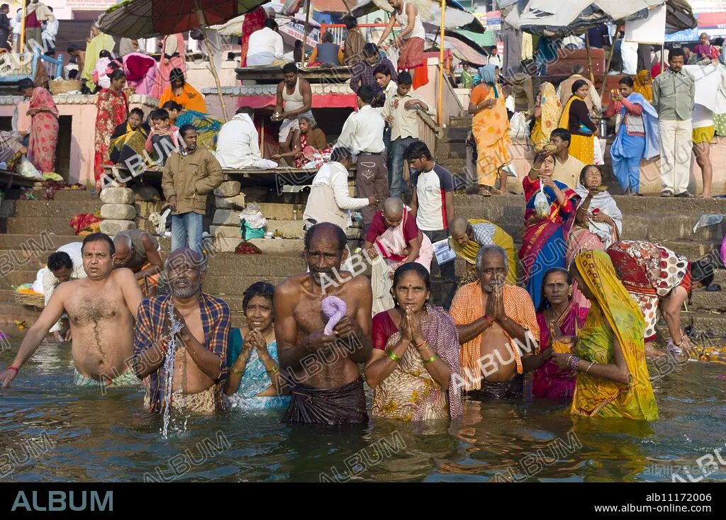 Indian Hindu pilgrims bathing in The Ganges River at Dashashwamedh Ghat in Holy City of Varanasi, Benares, India