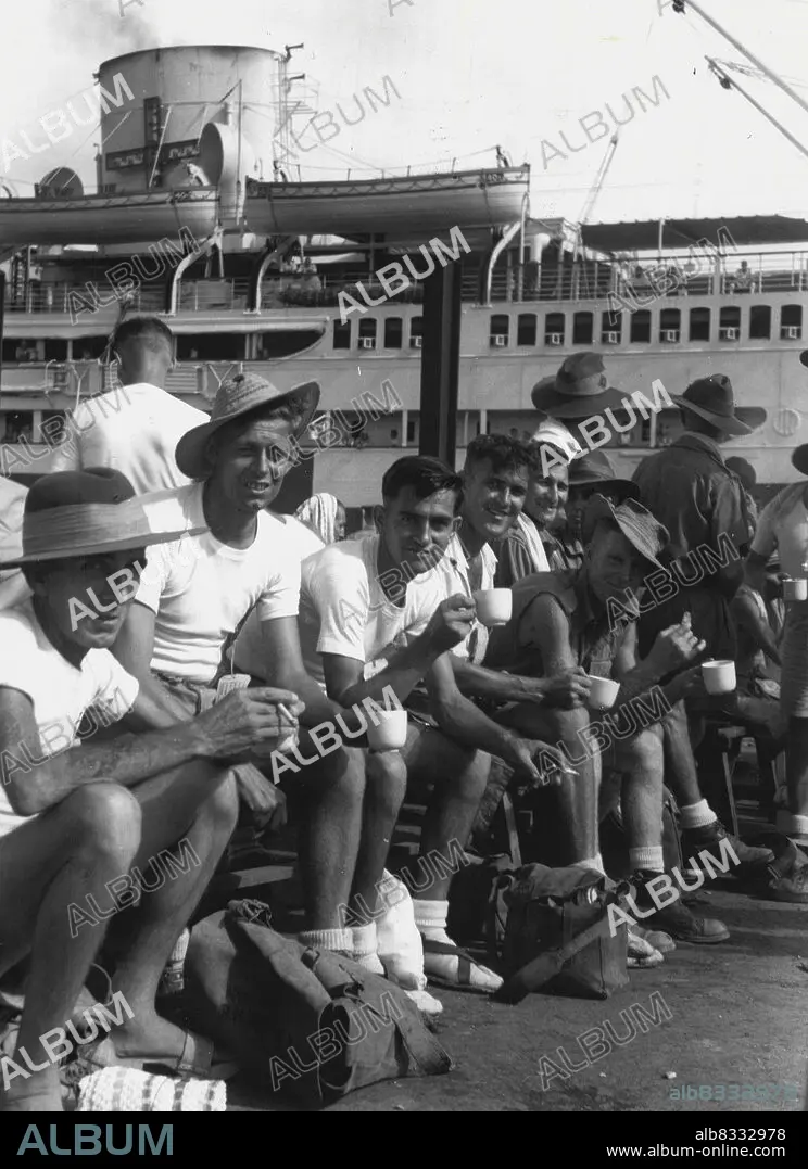 Caption: Prisoners of war released from Changi Prison Camp were evacuated from Singapore by the Australian Hospital Ship Manunda, the first Australian ship to arrive at Singapore after the surrender of the Japanene. Shown, a group of 8 Division. September 13, 1945. (Photo by Australian War Memorial Canberra).
