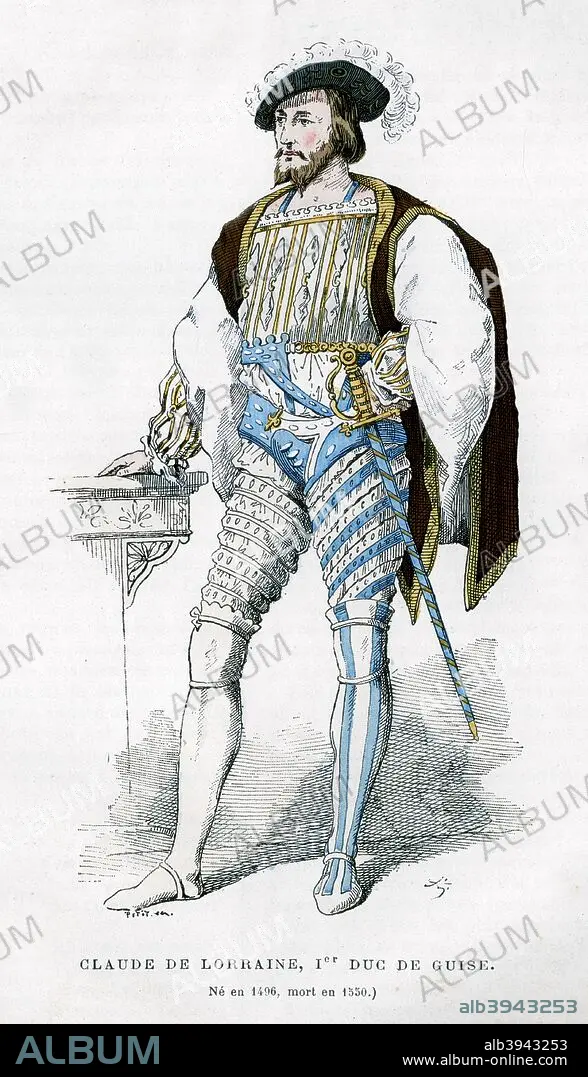 Claude de Lorraine, 1st Duke of Guise, 16th century (1882-1884). Claude (1496-1550) distinguished himself as a soldier fighting in the Italian Wars. He was made the first Duke of Guise by King Francis I when he returned to France in 1528 from his captivity at the hands of the Emperor Charles V. This made the Guises extremely powerful as they claimed precedence over the Bourbon princes of Conde and Conti. A print from La France et les Français à Travers les Siècles, Volume III, F Roy editor, A Challamel, Saint-Antoine, 1882-1884.