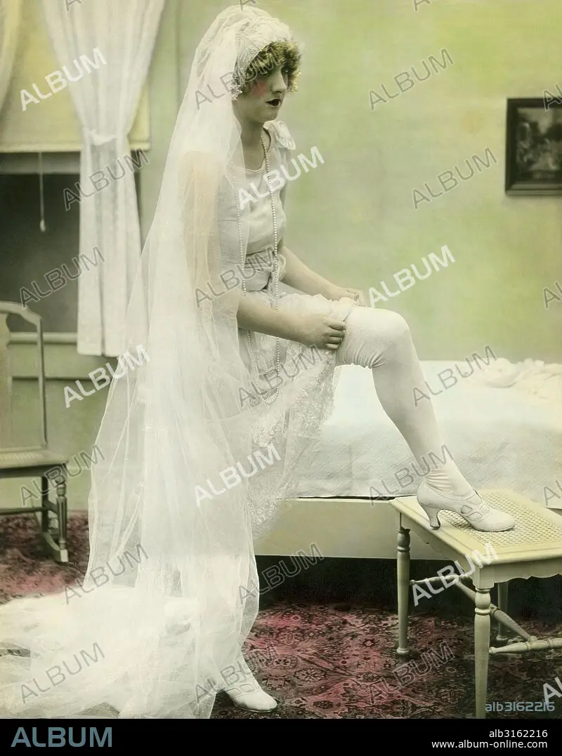 United States: c. 1925. A hand tinted photograph of a nervous looking bride taking off her stockings and titled, "The Bride Retires".