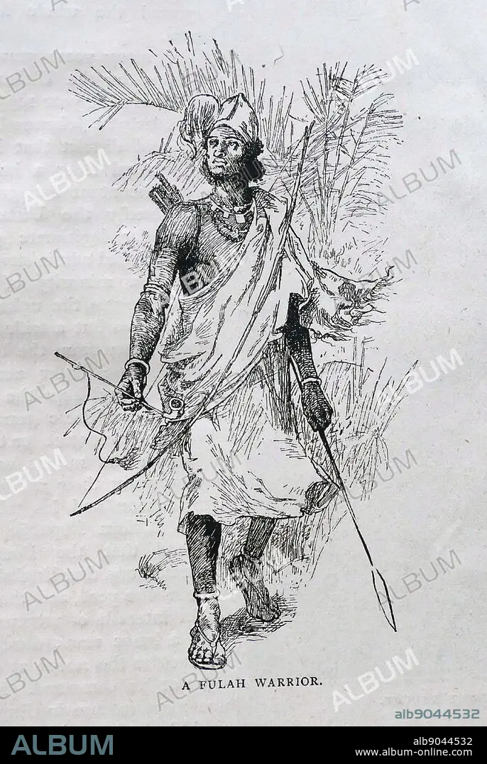 A Fulah Warrior. The Fula, Fulani, or Fulbe people are one of the largest ethnic groups in the Sahel and West Africa, widely dispersed across the region. Black and white drawing.