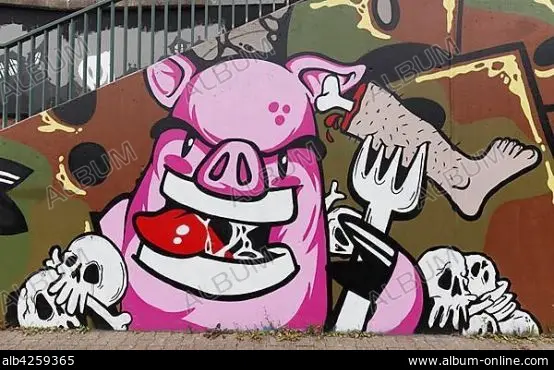 Pig eats human flesh, graffiti, criticism of meat consumption, vegan life, Düsseldorf-Eller, North Rhine-Westphalia, Germany, Europe.