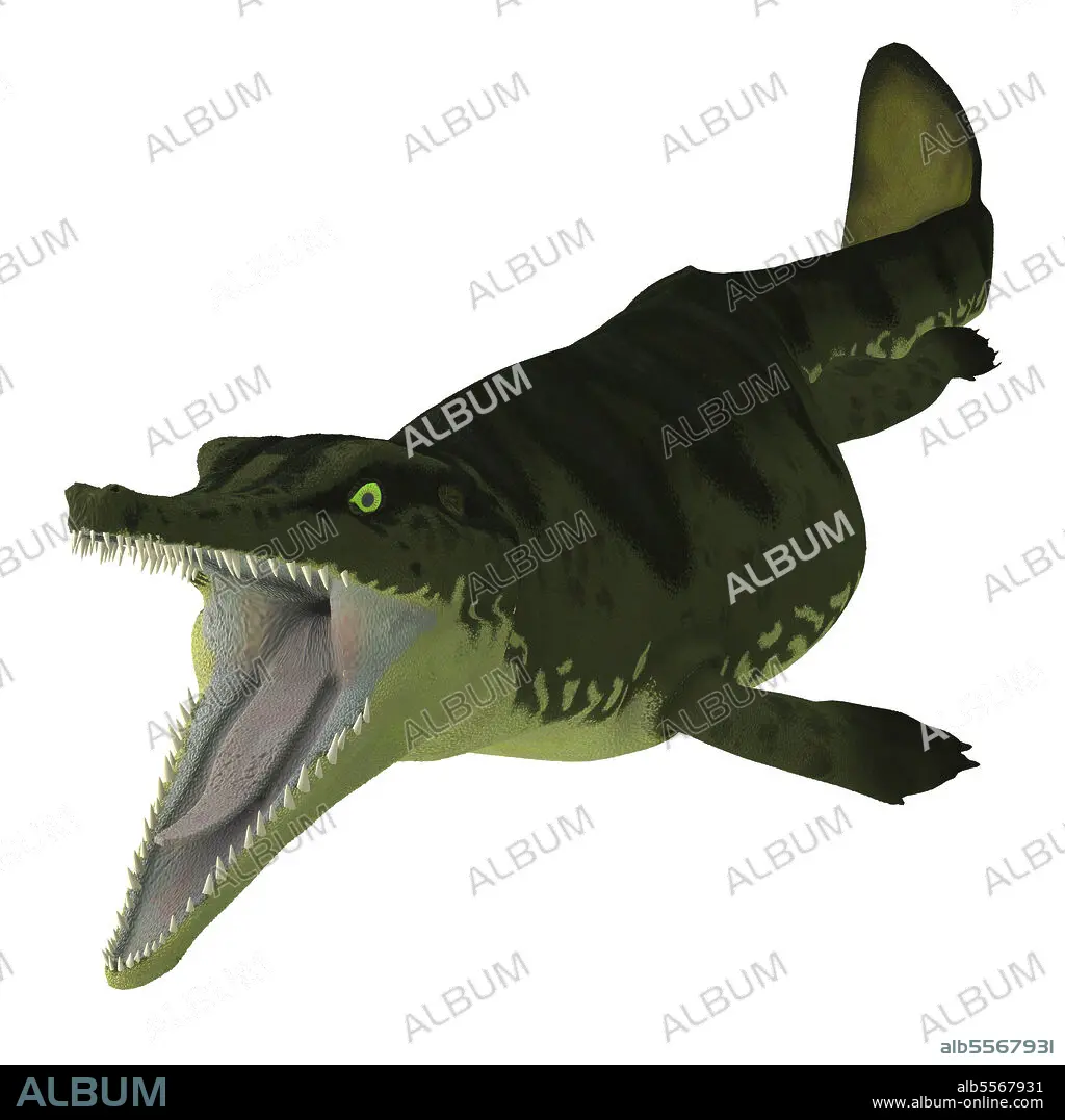 Caption: Metriorhynchus aquatic reptile with mouth open. Metriorhynchus was a carnivorous aquatic reptile that lived during the Jurassic Period of Europe.