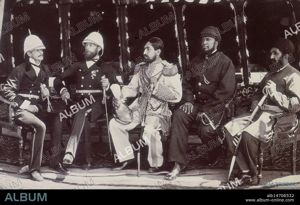 Caption: The Amir of Afghanistan with officials, Gandamak, Afghanistan, May 1879. During the Second Afghan War, Afghanistan became a British protectorate under the Treaty of Gandamak, which was signed by the Amir, (centre), and Lord Lytton the Viceroy of India, on May 26, 1879. Also present were Sir Louis Cavagnari, political officer on special duty; Mr Jenkyns; General Daud Shah; and Habeeboolah Mustataphi. Several months later Afghan soldiers rioted over pay; Cavagnari and Daud Shah were both killed.