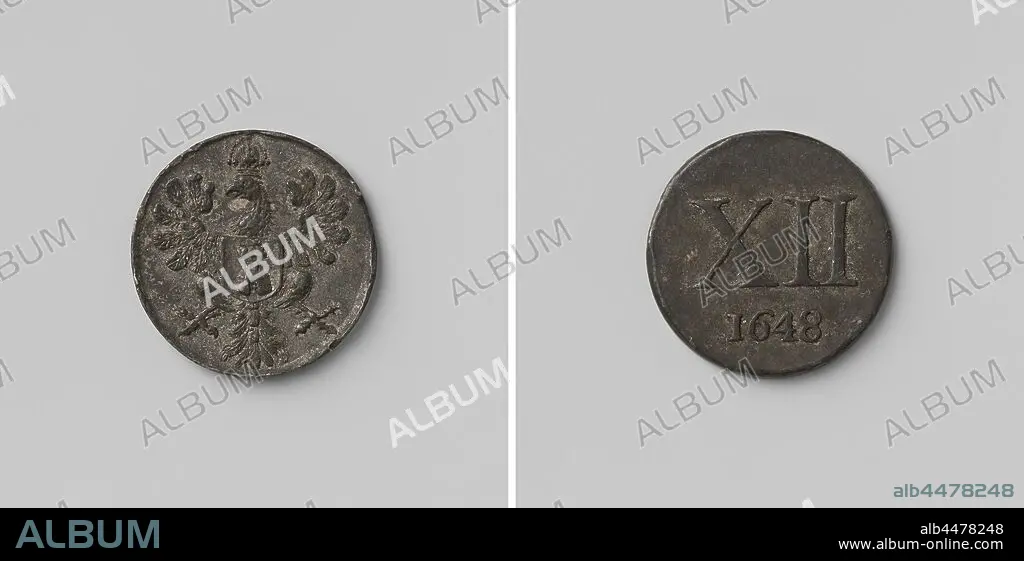 Caption: Vro Gereedschap from Middelburg, Medal worth 12 pence, Medal. Front: crowned eagle with coat of arms for chest. Reverse: Roman numeral XII above year, Middelburg, Johannes Looff, 1648, alloy, striking (metalworking), d 2.4 cm × w 5.17 gr