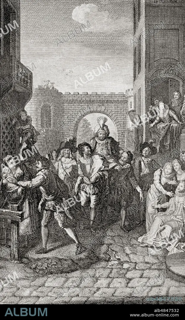 Caption: Sancho Panza entering as governor of the island of Barataria. After a scene in Miguel de Cervante's novel Don Quixote of La Mancha. From The International Library of Famous Literature, published c. 1900.