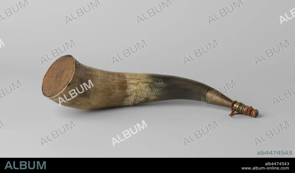 Caption: Cow horn herb horn with wooden base and copper mouth, Kruithoorn, wide part sealed with wooden bottom, copper staple smashed for attachment of string, on a narrow end cylindrical piece in various thicknesses of copper with wooden pin (top pin decorated with the same) with a piece of string attached., anonymous, Netherlands, 1800 - 1830, horn (animal material), copper (metal), wood (plant material), l 35 cm × d 7.3 cm