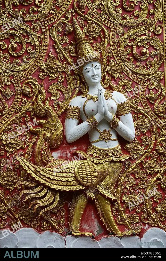 Kinnari or Kinari, mythological creature, relief, Wat Phrathat Lampang Luang Temple Complex, Lampang Province, Northern Thailand, Thailand, Asia.
