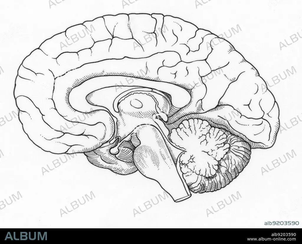 Caption: Anatomical illustration of the human brain, side view, showing frontal lobe, corpus callosum, optic chiasma, temporal lobe, pituitary gland, pons, medulla, spinal cord, cerebellum, occipital lobe, pineal body, parietal lobe, thalamus, and fornix.