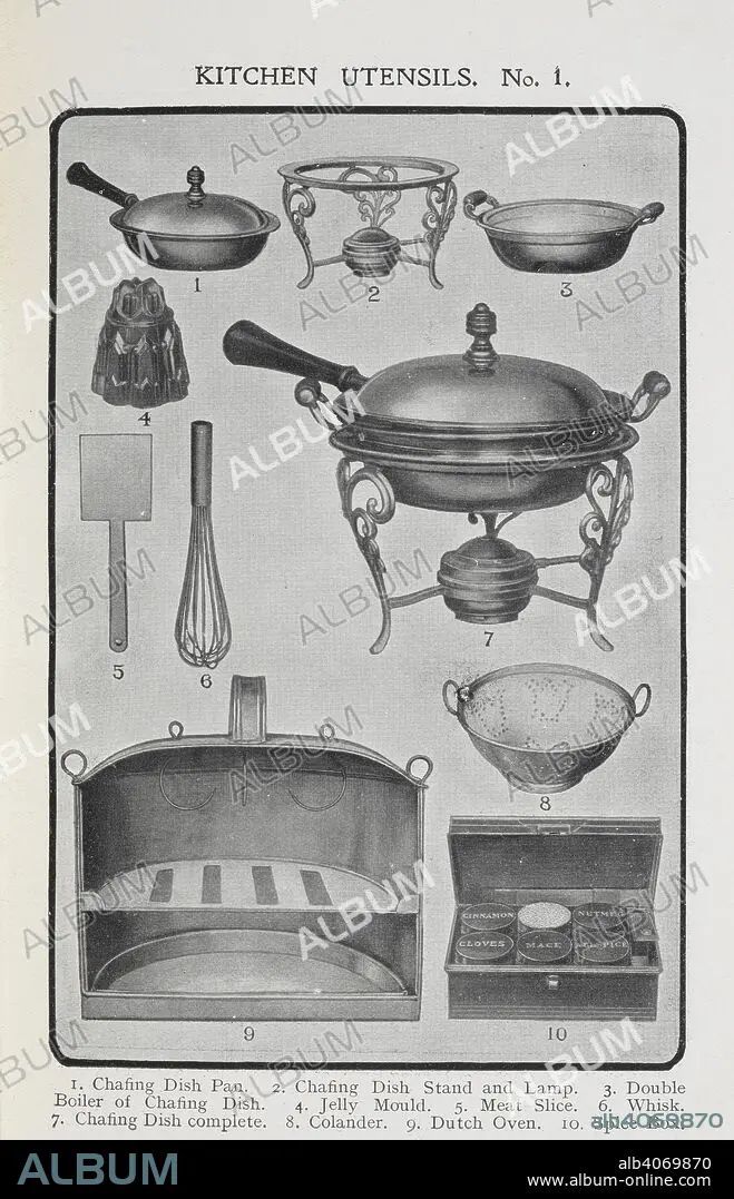 Caption: Kitchen utensils. Mrs. Beeton's Family Cookery and Housekeeping Book ... New ... illustrations, etc. [Another issue, in an altered form, of “Beeton's Every-day Cookery and Housekeeping Book.â€]. London : Ward, Lock & Co., 1907. Source: 07944.g.63. facing p. 48.