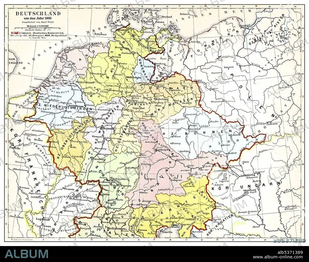 Historical map of Germany and Europe, Roman-German Empire in the 10th Century, from Meyers Konversations-Lexikon encyclopaedia, 1890