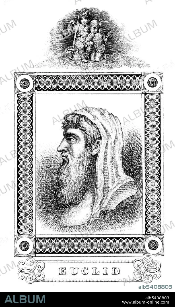 Caption: Euclid (meaning, good glory, 300 BC) was an ancient Greek mathematician, often referred to as the "Father of Geometry". Little is known about his life. The date and place of Euclid's birth and the date and circumstances of his death are unknown. No likeness or description of Euclid's physical appearance made during his lifetime survived antiquity. Therefore, Euclid's depiction in works of art is the product of the artist's imagination. Euclid brought together previous mathematical work and extended it. He recorded this in a systematic way in thirteen books called the Elements of Geometry. Six books deal with the geometry of planes, four with the theory of numbers and three with the geometry of solid objects. Euclid's work was translated into many different languages and it dominated mathematics for over 2000 years. The Elements of Geometry were the first mathematics books to be printed. Some errors were found in Euclid's work by the 19th century. However, most of his findings remain valid. Euclid also wrote works on perspective, conic sections, spherical geometry, number theory and rigor. No artist credited, engraving, undated.