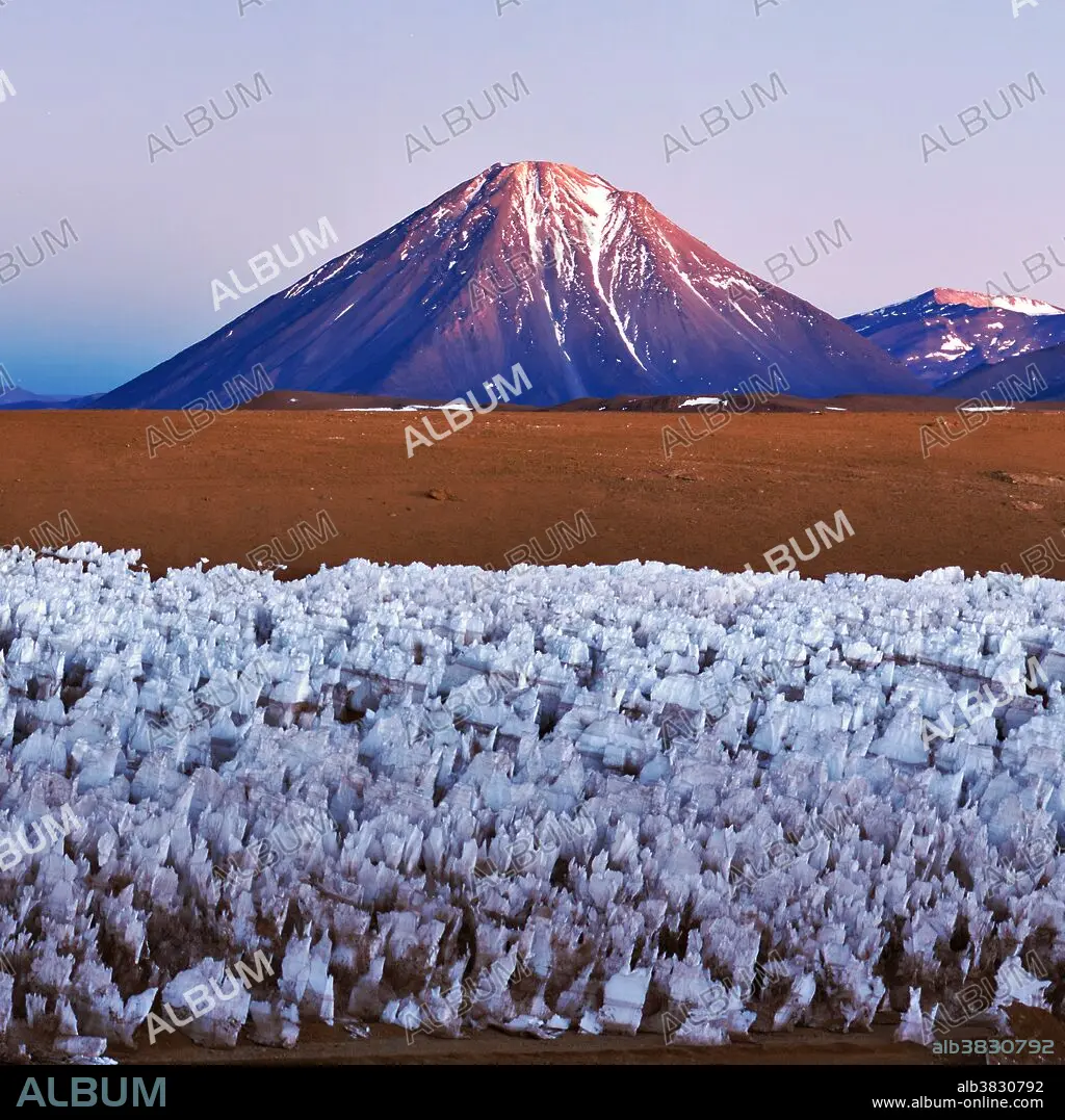 Caption: The spectacular Licancabur Volcano at the border between Chile and Bolivia. Licancabur appears in the morning twilight over an Andean ice field at an altitude of 5000 meters. The ice field in the foreground is a feature of high-altitude Andean plateaus known as ice penitentes. Licancabur reaches to 5920 meters. November 2011.