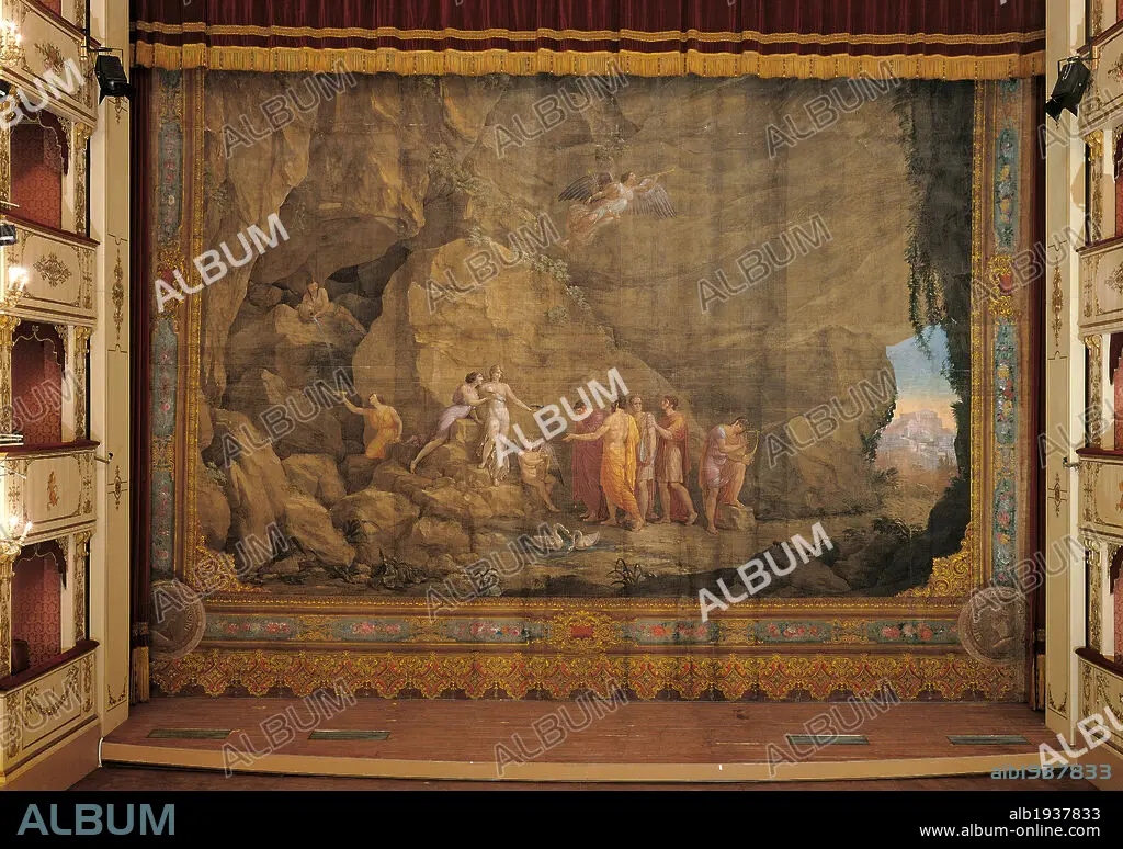 Caption: Italy, Marche, Pesaro, Teatro Rossini. Curtain of Teatro Rossini representing the mythogical episode of the source of Hippocrene. Muses and poets symbolizing the arts together in a ladscape with rocks and a spring.