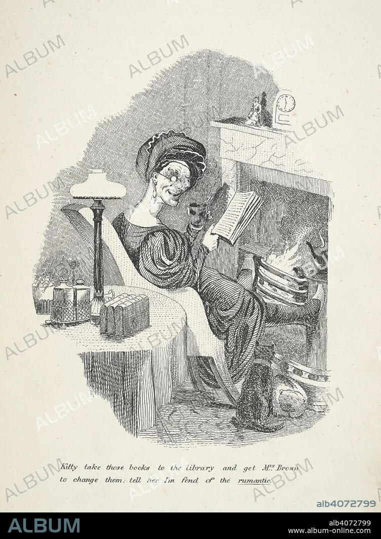 A satirical illustration of a woman reading a Gothic Romance novel. Seymour's Humorous Sketches. Ninety-seven caricature etchings. London : Frederick Bentley, [c. 1875]. Source: 12333.bb.21, plate 76. Language: English.