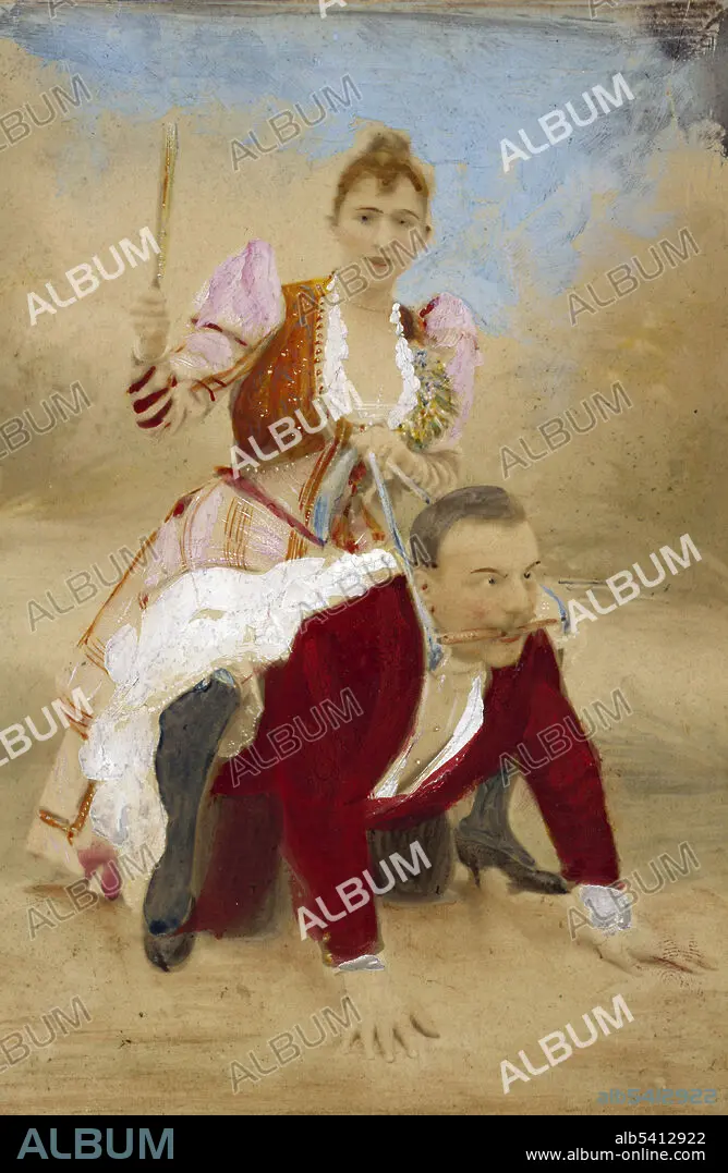 Caption: Man on all fours in red jacket with fully clothed woman riding him and holding a whip. From the collection of Richard Freiherr von Krafft-Ebing (August 14, 1840 - December 22, 1902; full name Richard Fridolin Joseph Freiherr Krafft von Festenberg auf Frohnberg, genannt von Ebing) an Austro-German psychiatrist. He studied medicine at the University of Heidelberg, where he specialized in psychiatry. He later practiced in psychiatric asylums. After leaving his work in asylums, he pursued a career in psychiatry, forensics, and hypnosis. His principal work is Psychopathia Sexualis: eine Klinisch-Forensische Studie (Sexual Psychopathy: A Clinical-Forensic Study), which was first published in 1886 and expanded in subsequent editions. Psychopathia Sexualis is a forensic reference book for psychiatrists, physicians, and judges. Written in an academic style, its introduction noted that, to discourage lay readers, the author had deliberately chosen a scientific term for the title of the book and that he had written parts of it in Latin for the same purpose. Psychopathia Sexualis was one of the first books about sexual practices that studied homosexuality/bisexuality, and popularized the terms sadism and masochism. He considered procreation the purpose of sexual desire and that any form of recreational sex was a perversion of the sex drive. He died in 1902 at the age of 62. No photographer credited, hand-colored,1890s.