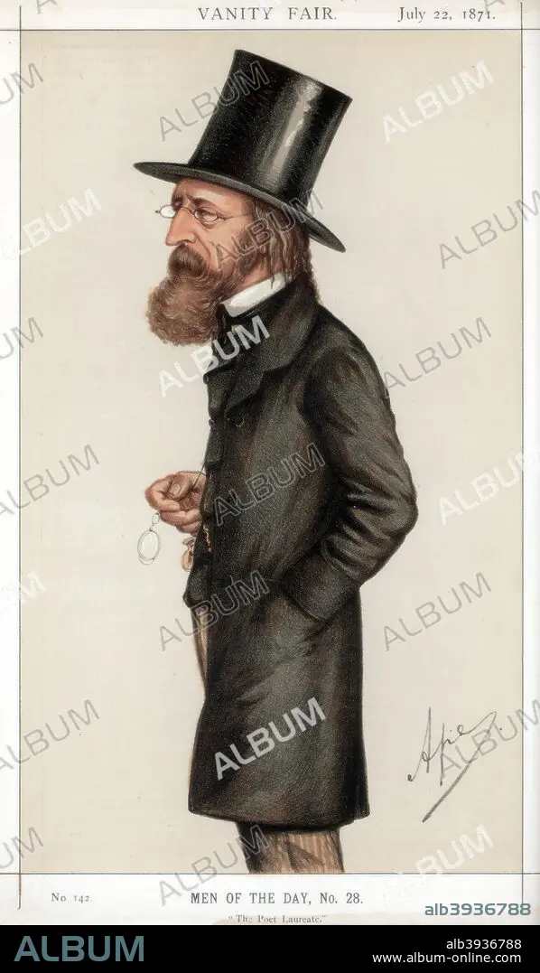 'The Poet Laureate', 1871. Alfred Lord Tennyson (1809-1892), English poet. One of the most popular English poets, he succeeded William Wordsworth as Poet Laureate of the United Kingdom in 1850 and held the position until his death. In 1884, Queen Victoria, who was an admirer of Tennyson's work, made him a baron. A print from Vanity Fair, 22 July 1871.