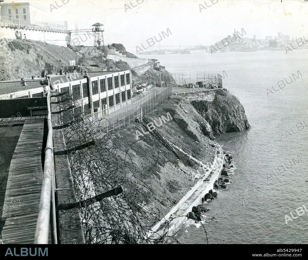 Caption: Alcatraz Prison, San Francisco, CA, circa 1940 - A view of the island taken from the industrial area with a guard tower, main cellhouse and San Francisco skyline in the background.