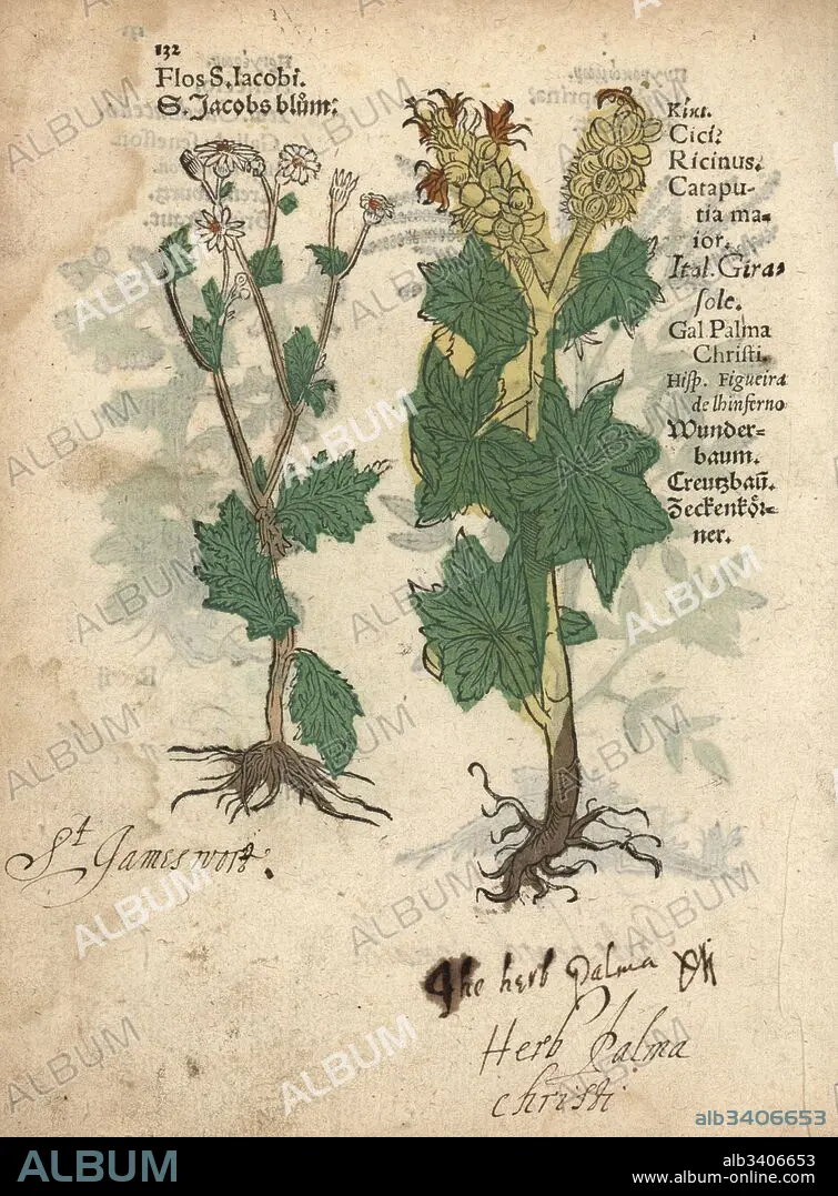 Ragwort or St. James wort, Jacobaea vulgaris, and castor oil plant, Ricinus communis. Handcoloured woodblock engraving of a botanical illustration from Adam Lonicer's Krauterbuch, or Herbal, Frankfurt, 1557. This from a 17th century pirate edition or atlas of illustrations only, with captions in Latin, Greek, French, Italian, German, and in English manuscript.
