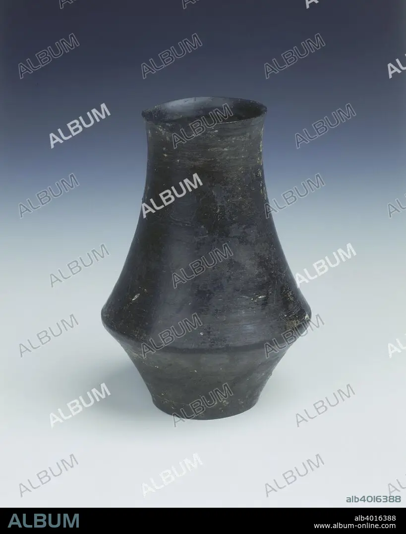 Caption: Black pottery beaker, Longshan culture, China, c2500 BC. An undecorated black beaker of very thin construction. The interior shows signs of having been formed on a potter's wheel, waisted outwards two thirds of the way down from rim to base. The beaker has a solid base.