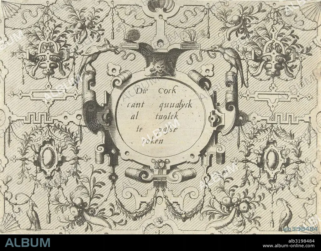 Caption: Cartouche surrounded by grotesques, left and right is a bird, Johannes or Lucas van Doetechum, Hans Vredeman de Vries, Hieronymus Cock, c. 1555 - c. 1560