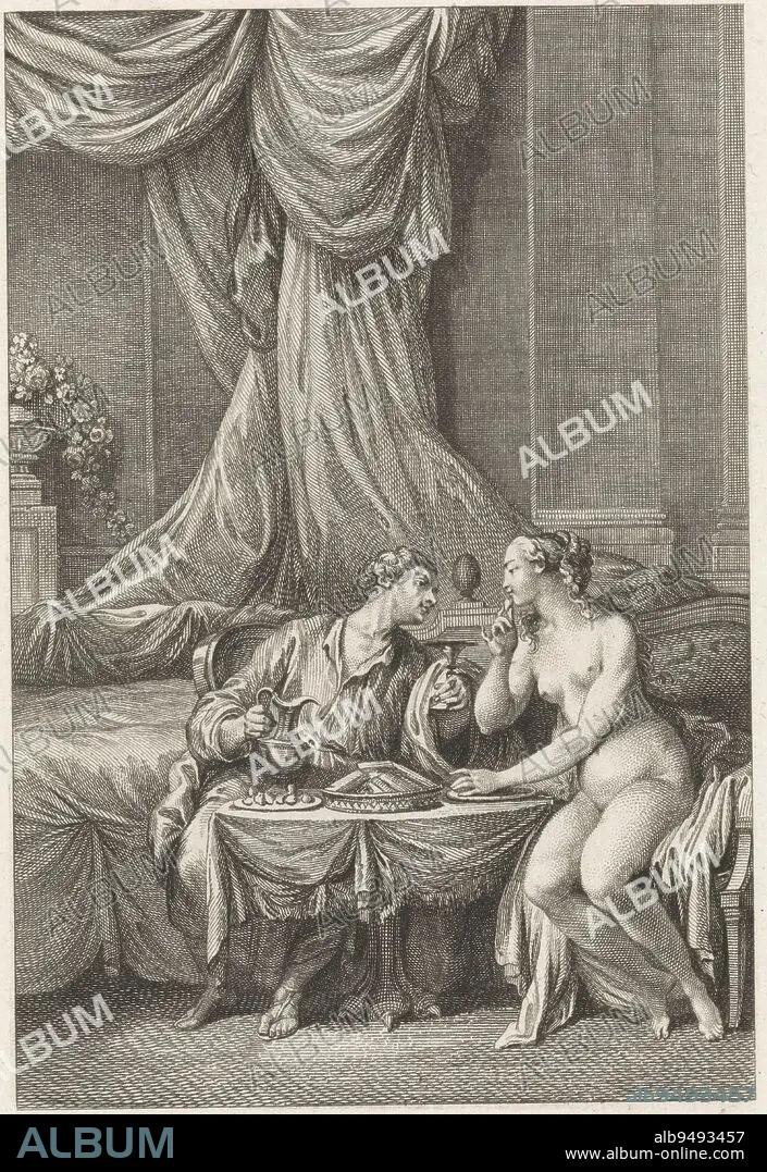 Caption: Pygmalion and Galatea his statue made alive at a dinner table Pygmalion pours his beloved wine while she enjoys some delicacies The print is part of a series on the story of Pygmalion, Pygmalion and Galatea at the dinner table Pigmalion on object, print maker: Emmanuel Jean Nepomucene de Ghendt, Charles Joseph Dominique Eisen, publisher: Thomas-Charles Naudet, (mentioned on object), Paris, 1748 - 1815, paper, etching, engraving, w 152 mm × h 230 mm