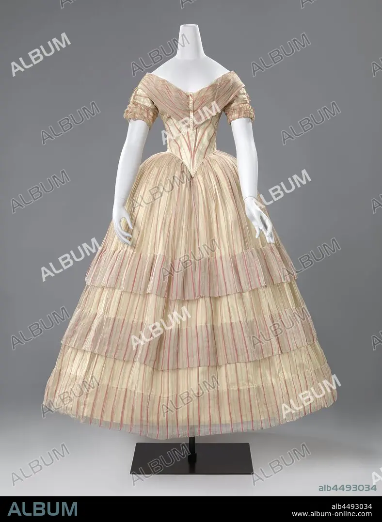 Caption: Full Evening Dress Evening gown, Girl's gown made of white tarlatan with pink stripes. The low-cut body has short sleeves and ends pointed at the front over the skirt to which it is sewn. The roomy skirt is unlined, has two wide girdles and a wide hem. I.v.m. exhibition there was made at the frock in 1996 an underskirt of cream satin (A-1)., anonymous, Netherlands, c. 1850 - c. 1856, tarlatan, cotton (textile), satin, silk, metal, l 122.0 cm